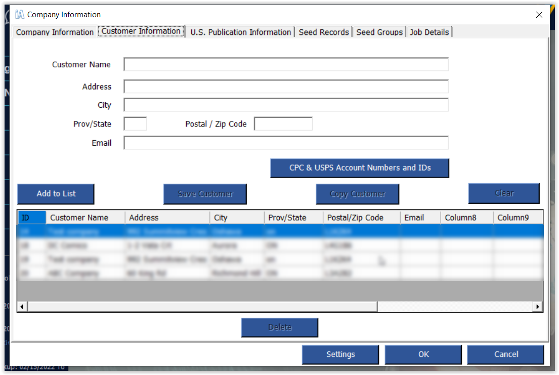Both the company and the customer information screen have a button to enter the various ID’s used by CPC and USPS. By clicking this button you will be taken to a new screen where you can enter at the very least, your CPC account number and/or your USPS mailerID & CRID.