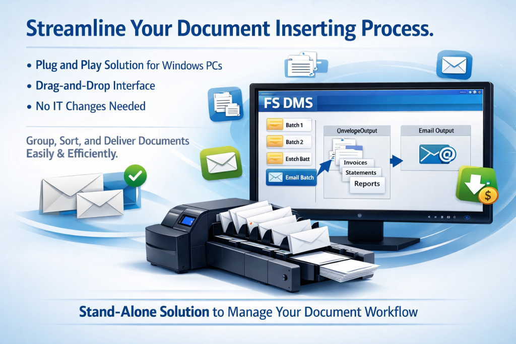 FS DMS delivers a seamless, plug‑and‑play solution for all your document inserting needs. Designed for Windows PCs, its intuitive drag‑and‑drop interface works effortlessly with your existing applications—no system changes or IT involvement required.