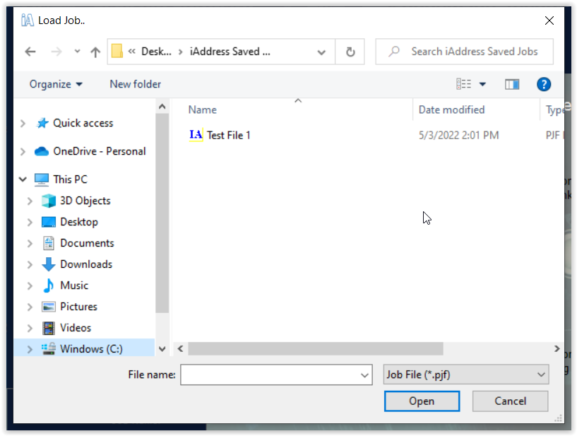 Open a Saved Job Open Job allows you to work on saved jobs. Select “Open Job” from the File menu. When the file list appears, select the appropriate .pjf file and click “OK”.